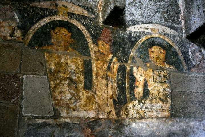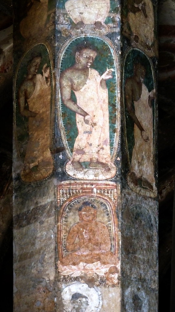 The Speciality of Pitalkhora Caves is Murals of Samyak Sambuddha wearing white colored robe. In Cave number three which is a Chaityagriha, there were 37 Octagonal Pillars, but now only 12 pillars remain in their original form. It has beautiful Samyak Sambuddhas depicted on it. We can see Tathagata wearing Saffron Colored Robe here. If you can, you can see these characteristic murals on the left side wall of the Chakraman or Circumambulation Path designed to pay homage to the stupa. The paintings on the octagonal pillars seem to be of a somewhat primitive form, while the murals on the circumnavigation path seem to be of a more serious nature.